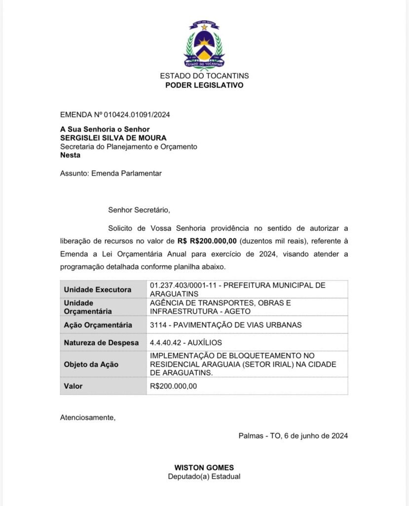 De acordo com o deputado, a emenda foi destinada para o calçamento de ruas do setor Irial. Por se tratar de uma obra estruturante, o recurso foi encaminhado por meio da Agência de Transportes, Obras e Infraestrutura do Tocantins (AGETO), responsável pelo acompanhamento de recursos dessa natureza.